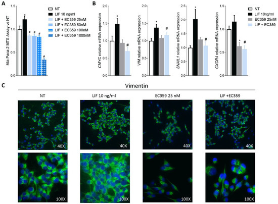 LIFR inhibition reverses pancreatic cancer cell proliferation and EMT process promoted by LIF. MIA PaCa-2 cells were serum-starved and primed with LIF (10 ng/mL) alone or in combination with increasing concentrations of LIFR antagonist, EC359 (25, 50,100, 1000 nM). Data shown are (A) dose-response curve of EC359 (25, 50, 100, 1000 nM) determined using MTS assay on cells. Each value is expressed relative to the non-treated (NT) value, which is arbitrarily set to 1. Results are the mean ± SEM of 10 samples per group. (B) Relative mRNA expression of the proliferation marker C-Myc; the EMT markers VIM and SNAIL-1; and CXCR4. Each value is normalized to GAPDH and is expressed relative to those of positive controls, which are arbitrarily set to 1. Results are the mean ± SEM of five samples per group (* represents statistical significance versus NT, and # versus LIF, p < 0.05). Panel (C) shows changes in vimentin expression assessed by immunofluorescence analysis in MIA PaCa-2 cells triggered with LIF (10 ng/mL) alone or in combination with EC359 25 nM.