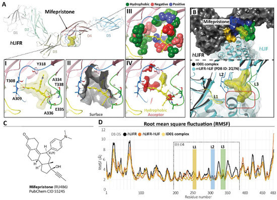 Modelling. (A) hLIFR-ID01 complex. The protein backbone is displayed in ribbon and coloured by distinguishing the five domains (D1–D5). In the zoom view, (I) the ID01 binding mode of mifepristone (displayed as yellow ball and stick), highlighting the “T-inverted” shape; (II) the “T-inverted” shape well-fit with hLIFR surface; (III) the main residues involved in the interactions with the mifepristone; (IV) the hydrophobic (yellow) and hydrogen bond acceptor (red) maps fit with mifepristone. The principal residues are labelled and highlighted in wireframe or CPK(A3), while hydrogen bonds are in dashed black lines. (B) Superimposition between the ID01 best MM/GBSA value pose (black) and the mLIFR-hLIF X-ray (PDB ID: 2Q7N) (cyan). The three loops L1 (255-VSASSG-260), L2 (303-NPGRVTALVGPRAT-316), and L3 (332-KRAEAPTNES-341) are highlighted in yellow, blue, and green, respectively. The red rectangle highlights the clash with the propyne moiety of mifepristone and hLIF. (C) Two-dimensional structures of mifepristone. (D) The root means square fluctuation (RMSF) plot of the three compared systems (ID01 complex, hLIFR-hLIF, and hLIFR) during 100 ns of MDs.