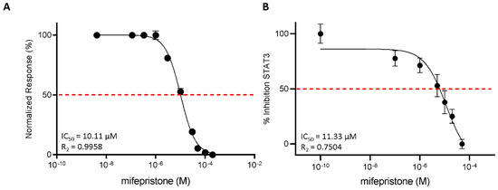 To perform STAT3 transactivation, HepG2 (HB, 8065 from ATCC), an immortalized human epatocarcinoma cell line was used. On day 0, HepG2 were seeded at 7.5 × 104 cells/well in a 24-well plate and maintained at 37 °C and 5% CO2 in E-MEM supplemented with 10% FBS, 1% glutamine, and 1% penicillin/streptomycin. On day 1, cells were transiently transfected with the reporter plasmid pGL4.47[luc2P/SIE/Hygro] (200 ng) (CAT#: E4041 Promega, Madison, WI, USA), a vector encoding the hLIFR (CAT# RC226327) (100 ng) and CD130 (IL6ST) (100 ng) (CAT#: RC215123, OriGene Technologies, Inc. Rockville, MD, USA), and finally a vector encoding the human RENILLA luciferase gene (pGL4.70) (100 ng) (Promega, Madison, WI, USA). On day 2, cells were primed with the cytokine LIF (10 ng/mL) alone or in combination with mifepristone (10, 20, 50 μM). Then, after 24 h, cellular lysates were assayed for luciferase and RENILLA activities using the Dual-Luciferase Reporter assay system (Promega, Madison, WI, USA). Luminescence was measured using a Glomax 20/20 luminometer (Promega, Madison, WI, USA). LUCIFERASE activities (RLU) were normalized with RENILLA activities (RRU).