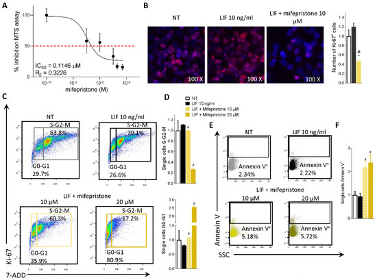 To functionally characterize the effect of mifepristone on MIA PaCa-2 cells, we ran an MTS assay. The MIA PaCa-2 cells were grown in a serum-free medium containing 10 ng/mL LIF alone or in combination with increasing concentrations of mifepristone (0.1, 1, 10, 20, 50 µM) for 48 h. As shown in Figure 6A, mifepristone reversed the LIF-proliferative effect in a concentration-dependent manner with an IC50 of 0.11 µM.