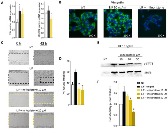 Because these findings suggest that exposure to LIF might promote the acquisition of a migratory phenotype, we measured the motility of MIA PaCA-2 cells in scratch wound healing assay, as described in the Materials and Methods (Figure 7C). For these purposes, MIA PaCa-2 cells were grown in a complete serum-starved DMEM medium, and after the production of a scratch (Day 0), cells were challenged with 10 ng/mL LIF, alone or in combination with mifepristone (10 and 20 µM). The ability of cells to gain a migratory phenotype was calculated by the measuring of the area between the two scratch borders at the time points 0 h and 48 h. As illustrated in Figure 7D, LIF promoted cell migration and wound closure, with a reduction of the wound area by 59.69% at 48 h. These findings were reversed by treatment with mifepristone (p < 0.05). Mifepristone significantly reduced MIA PaCa-2 migration in a concentration-dependent-manner.