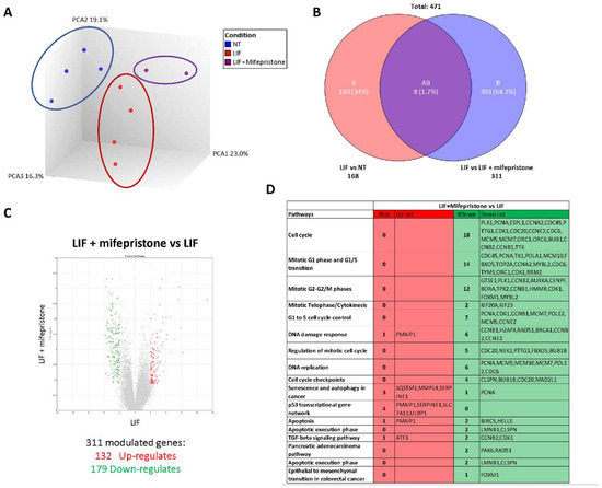 To gain further detail on the transcriptional profile promoted by LIF and mifepristone, AmpliSeq Transcriptome analysis (RNAseq) was performed on MIA PaCa-2 cells left untreated or treated with LIF alone or in combination with 10 µM mifepristone for 24 h. The Principal Component Analysis (PCA) of the transcriptome (Figure 8A) revealed major dissimilarities between MIA PaCa-2 left untreated or treated with LIF or LIF/mifepristone.