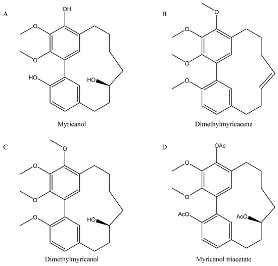 Chemical structure of myricanol and its derivatives. In the figure are reported the structures of myricanol derivatives: (A) myricanol, (B) dimethylmyricacene, (C) dimethylmyricanol and (D) myricanol triacetate.