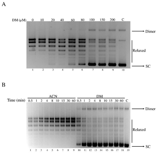 Inhibition of the catalytic activity of hTop1 by DM. (A) Relaxation assay in the presence of different concentrations of DM, ranging from 10 µM to 200 µM (lanes 2–9), performed in a dose-dependent manner. Samples were incubated in the presence and absence of DM and incubated for 1 h at 37 °C, then were resolved on an agarose gel and stained with EtBr. Bands were visualized by a UV transilluminator. Lane 0 represents the positive control where the supercoiled DNA is incubated with the solvent and enzyme, lane 10 is the negative control with the supercoiled and DM only. (B) Time course assay in the presence of 100 µM DM (lanes 10–19) or with the same amount of ACN (lanes 1–9). The results were analyzed on an agarose gel, stained with EtBr and visualized by a UV transilluminator.