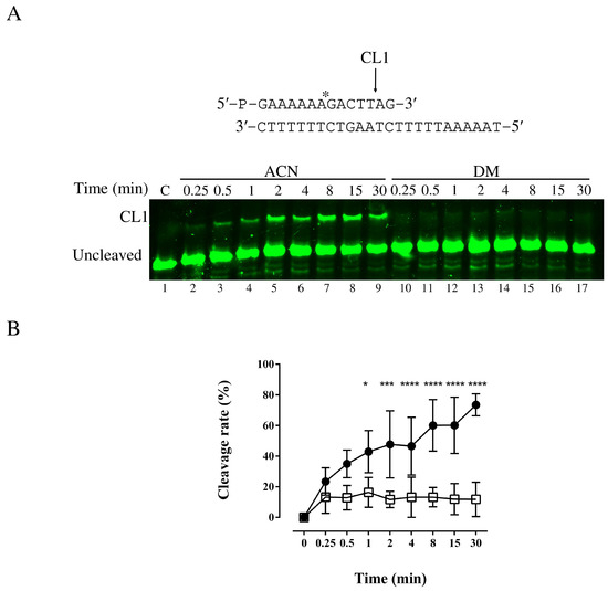 Analysis of Cleavage of the hTop1 catalytic mechanism on the fluorescently labeled SS. (A) Cleavage assay of hTop1 in the absence and presence of DM. Top panel is a schematic representation of SS, the bottom panel is a denaturing polyacrylamide gel. Samples were incubated at 25 °C in the absence and presence of 100 µM and the reaction was stopped at different time points with 2.5% SDS. Samples were resolved on a denaturing polyacrylamide gel and visualized by ChemiDoc MP imaging system. CL1 cleaved strand, C is the negative control. (B) Plot of the percentage of the cleavage rate as function of time. Black circles represent the enzyme incubated in the presence of ACN while the white squares reported the effect of DM at 100 µM. The plot reports the cumulative data of four independent experiments with mean ± SD values. Asterisks indicate * p ≤ 0.05, *** p ≤ 0.001, **** p ≤ 0.0001.
