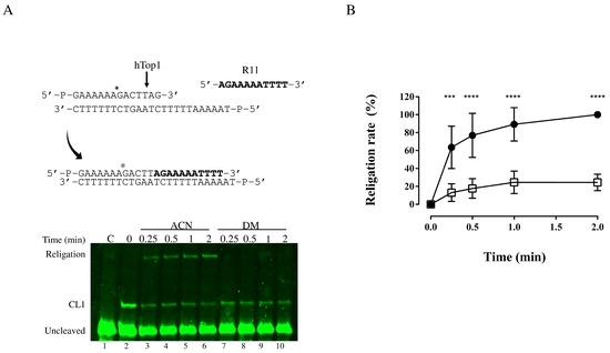 Analysis of the religation of the hTop1 catalytic mechanism on the fluorescently labeled SS. (A) Top panel reported the sequences of the fluorescently labeled SS for the religation assay. Bottom panel is a denaturing polyacrylamide gel of the religation assay. Samples were incubated 1 h at 25 °C and then 30 min at 37 °C. Reaction started by adding a 200-fold excess of R11 oligonucleotide in the absence and presence of 100 µM of DM, and then stopped at different time points with 2.5% SDS. CL1 is the cleaved strand, C is the negative control and 0 is the starting condition before adding R11. (B) Plot of the religation assay where the percentage of the appearance of the religated bands as function of time is reported. Black circles and white squares represent DM and can, respectively. The figure shows the cumulative data, with mean ± SD values, of three different experiments. Asterisks indicate * p ≤ 0.05, *** p ≤ 0.001 and **** p ≤ 0.0001.