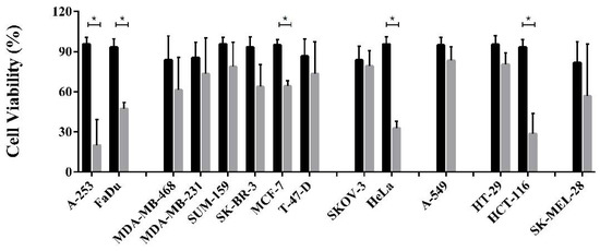 We next asked whether DM could be used as a possible lead compound to treat cancer cells. To validate the activity of the compound, we performed a cell viability assay on A-253, FaDu, MDA-MB-468, MDA-MB-231, SUM-159, SK-BR-3, T-47-D, SKOV-3, HeLa, A-549, HT-29, HCT-116 and SK-MEL-28 cell lines. In this assay, we observed, as reported in Figure 5, that among all the cell lines tested A-253, FaDu, MCF-7, HeLa and HCT-116 show a significant viability reduction after the 48 h incubation at 37 °C, in the presence of 100 µM DM.