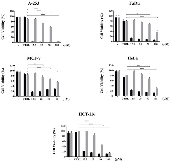 Then, to identify the minimal dose that impairs cancer cells viability, the same assay was performed in a dose dependent manner (Figure 6). All of the cell lines significantly affected by DM in the previous experiment were incubated at 37 °C for 48 h with different concentrations of DM, ranging from 12.5 to 100 µM. Viable cells were stained by incubating with the MTT reagent for 4 h. TPT was used as the positive cytotoxicity control (Figure 6 black bars). The percentage of the cell viability reduction was calculated, relative to the control with the solvent DMSO and ACN for TPT and the compound, respectively.