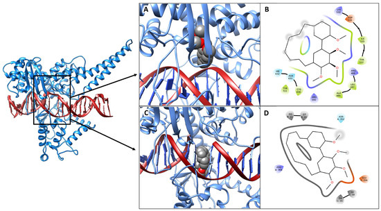 Three-dimensional structure of the hTopI-DNA-drug complexes. The hTop1 structure is represented as a blue cartoon, while the DNA is shown as red ribbons. (A) Three-dimensional best binding pose obtained for the drug within the catalytic site. (C) Three-dimensional best binding pose obtained for the drug in an intercalated configuration. DM is shown as a space fill model, colored by the atom type, with carbon atoms in grey. The pictures were obtained using Chimera [50]. (B,D) Two-dimensional schematic view of the interactions between the drug and the hTop1-DNA complex for the two poses. Labels indicate base or residue names and their numbering in the structure. The pictures were created using the Maestro software (Schrödinger Release 2022-2: Maestro, Schrödinger, LLC, New York, NY, USA, 2021).