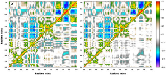 Dynamic cross-correlation maps (DCCM), based on the atomic fluctuations of 565 Cα atoms of hTop1, were generated from the three MD trajectories of the hTop1-DNA and hTop1-DNA-drug complexes, to evaluate whether the presence of the drug could induce changes in the structural-dynamical properties of the enzyme. In this representation, the positive values indicate a correlation of the motion between the two residues, which move in the same direction in space, while negative ones represent an anti-correlated motion, with residues moving in opposite directions. Indeed, MD simulations identify strong differences between the unbound and bound complexes and show the presence of functional structural motions in the hTop1 unbound structure (Figure 8A,B, upper left triangles).