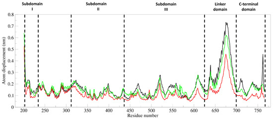 The unbound hTop1-DNA simulation is characterized by the presence of highly correlated and anti-correlated motions, that underpin the catalytical mechanism, as already described in our previous studies. The presence of the DM within the binding pocket almost completely destroys these correlated motions (Figure 8A,B, lower right triangles). The presence of the compound causes the intra- and inter-domain protein motions to become almost completely uncorrelated, except for a small anti-correlated region between subdomain I (residues 300–350) and the linker region (residues 636–712) and the scattered positively correlated motions in proximity of the three subdomains of the hTop1 core region (residues 250–575). To characterize the main regions showing different flexibilities in the bound and unbound hTop1-DNA complexes, we performed a principal component analysis (PCA) on the two MD trajectories. This technique identifies the principal 3N directions defining most of the protein motion. Atomic displacements, calculated for each Cα atom of hTop1 along the first eigenvector, show that the unbound hTop1 structure has globally a higher degree of flexibility, mainly located in the linker domain, in subdomain III, and in the C-terminal domain (Figure 9, black line). The linker is the most flexible region of hTop1 in both the systems, but in the unbound one, it is characterized by about two-fold the flexibility observed in the bound states (Figure 9, red and green lines).