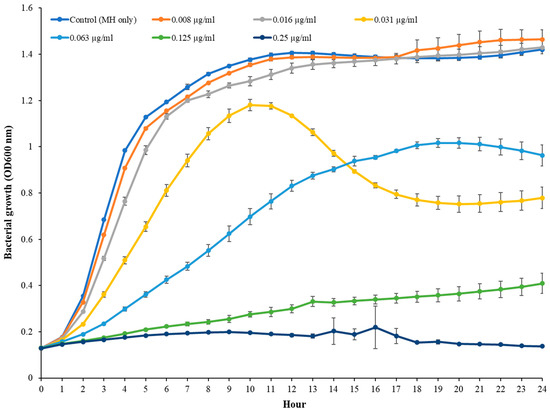 2.2. Determination of Minimum Inhibitory Concentration (MIC) and Viable Bacterial Cell Numbers