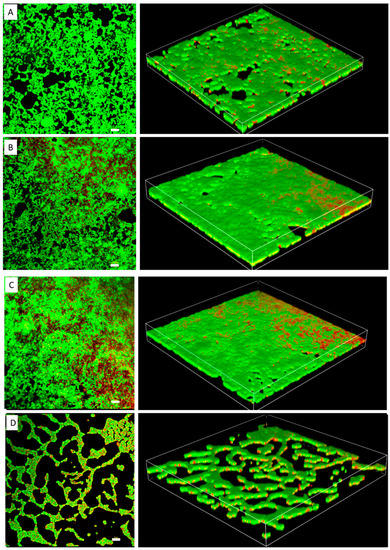 Confocal laser scanning microscopy images of S. epidermidis strain RP62A biofilms. The scale bar in all the images corresponds to 10 μm. Left panels show an orthogonal view of the top biofilm layer and right panels show 3D images. (A): Control, (B): 1/8 MIC, (C): 1/4 MIC, (D): 1/2 MIC.