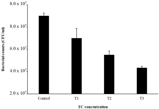 Bacterial cell counts after TC treatment. Experiments were performed in triplicate to calculate the mean and standard deviation.