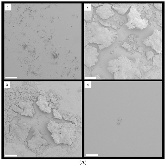 FESEM images of S. epidermidis strain RP62A biofilms. The scale bar in all the images corresponds to 200 µm (A) and 0.5 µm (B). Arrows indicate membrane vesicles. (1): Control, (2): 1/8 MIC, (3): 1/4 MIC, (4): 1/2 MIC.