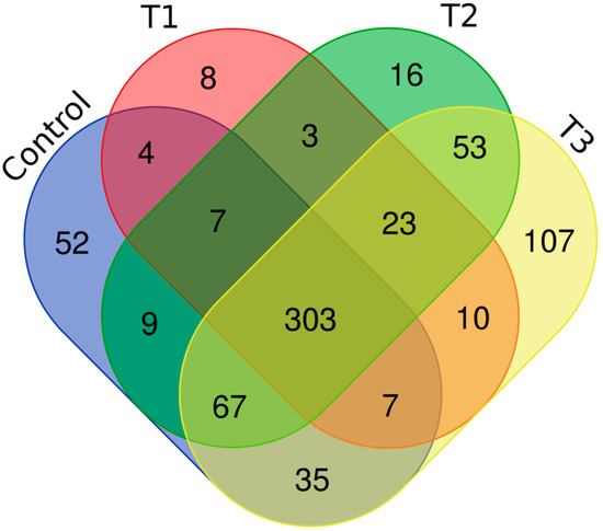Distinct proteomic data sets were induced when strain RP62A biofilms were exposed to increasing levels of TC. From the proteomic data analysis, 484, 480, 530, and 629 proteins were identified from control, T1, T2, and T3 biofilms, respectively (Table S1, Figure 5). A Venn diagram indicated that 303 proteins were commonly observed in all comparison groups, whereas 52, 8, 16, and 107 proteins were uniquely detected in control, T1, T2, and T3 biofilms, respectively (Figure 5). As showed in the heatmap analysis (Figure 6), the proteomic data set revealed an apparent correlation between the profiles of protein expression with respect to TC concentrations. In T1, T2, and T3 biofilms, 413, 429, and 518 proteins were differentially expressed, respectively, containing 165, 243, and 383 upregulated and 248, 186, and 135 downregulated (Figure 7).