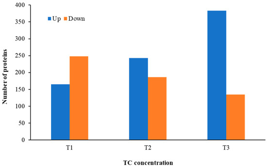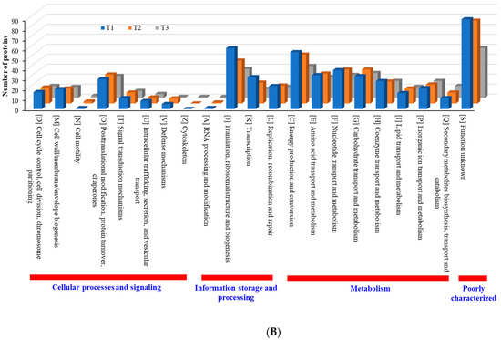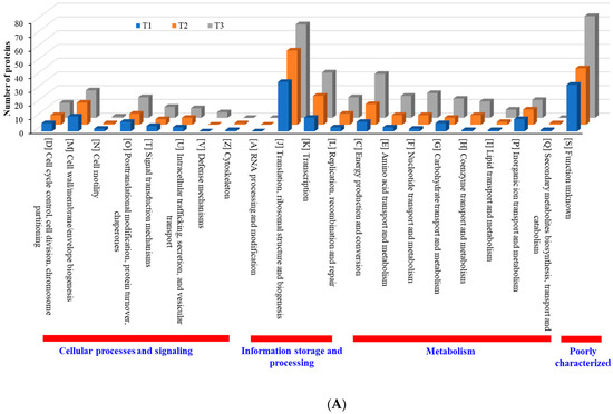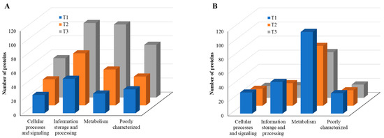 According to COG functional category analysis [26], there are four main categories, including: (i) cellular processes and signaling, (ii) information storage and processing, (iii) metabolism, and (iv) poorly characterized. As the TC concentration increased, the number of upregulated proteins in each category increased, but the number of downregulated proteins decreased (Figure 8). This result indicates that strain RP62A biofilm cells sense and respond to TC in a different way, depending on the antibiotic concentration. Additionally, “information storage and processing” and “metabolism” were the most affected COG categories in upregulated proteins (Figure 8A).