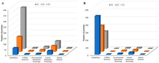 KEGG pathways of five major groups in differentially expressed proteins identified from S. epidermidis strain RP62A biofilms grown with sublethal MIC of TC. (A): upregulated proteins, (B): downregulated proteins, T1: 1/8 MIC, T2: 1/4 MIC, T3: 1/2 MIC.