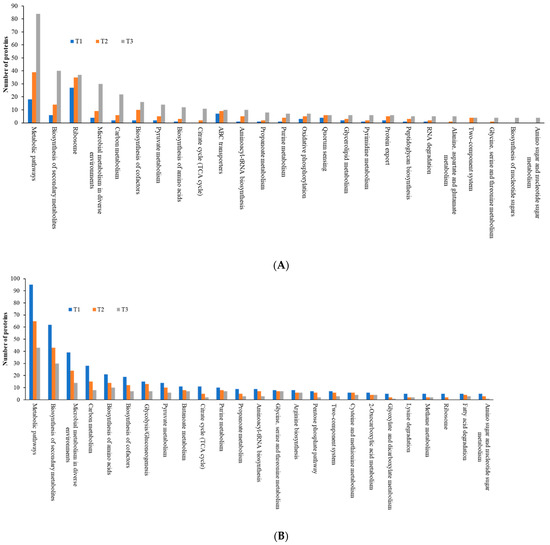 Top 25 KEGG pathways in differentially expressed proteins identified from S. epidermidis strain RP62A biofilms grown with sublethal MIC of TC. (A): upregulated proteins, (B): downregulated proteins, T1: 1/8 MIC, T2: 1/4 MIC, T3: 1/2 MIC.
