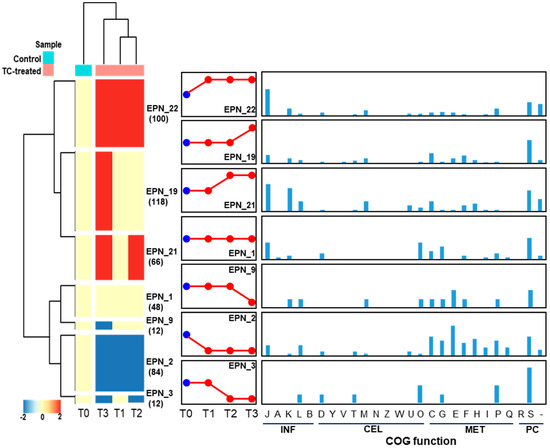 Protein expression pattern analysis tool that is integrated with COG functional category analysis, was used to cluster proteins that show a similar temporal expression pattern. In total, 27 significant temporal protein expression profiles were clustered as shown in Figure 12. When strain RP62A biofilms were treated with TC, about 100 proteins involved in information storage and processing (INF; J, K, and L), cellular processes and signaling (CEL; D, M, U, and O), and metabolism (MET; C, G, E, and P) were significantly upregulated (EPN22). Notably, translation, ribosomal structure and biogenesis (J) accounted for the largest portion (30 proteins, 40.5%) of the upregulated proteins. About 48 proteins included in EPN1 were consistently identified in all TC-treated biofilm samples including control and the majority of them consisted of translation, ribosomal structure and biogenesis (J), posttranslational modification, protein turnover, chaperones (O), and carbohydrate transport and metabolism (G). As revealed in EPN2, proteins associated with INF (J and L) and MET (C, G, E, F, H, I, P, and Q) were substantially downregulated in all TC-treated biofilms (T1, T2, and T3). Protein expression patterns that were upregulated (EPN19) or downregulated (EPN9) only at the highest TC concentration were confirmed.