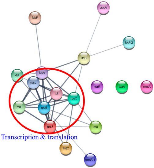 Protein–protein interaction network analysis of differentially expressed proteins associated with antibiotic resistance using STRING database and Cytoscape. Transcription and translation proteins were indicated by a red circle.