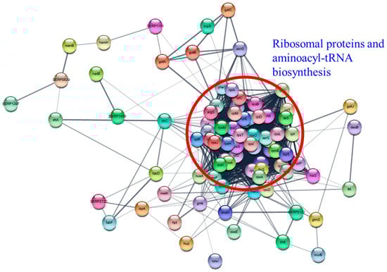 Protein–protein interaction network analysis of differentially expressed proteins associated with essential genes using STRING database and Cytoscape. Ribosomal proteins and aminoacyl-tRNA biosynthesis proteins were indicated by a red circle.