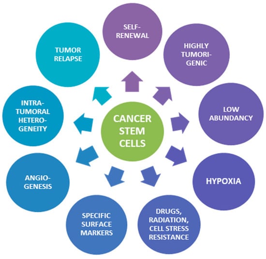 CSC proliferation is stimulated in a hypoxic microenvironment due to elevated expression of hypoxia-inducible factor (HIF) and cancer-associated fibroblasts (CAF); such an environment may instigate necrosis in the tumor mass []. Hypoxia can also influence multidrug resistance (MDR) through increased expression of ATP-binding cassette (ABC) transporters leading to a sustained CSC population by decreased drug concentration. Hypoxia and MDR forms one of the major hallmarks of cancer stem cells, others include properties such as self-renewal and differentiation which not only lead to intra-tumoral heterogeneity but also aid in tumor recurrence (Figure 1). They express specific cell surface markers such as CD24, CD34, CD44, CD90, CD133, and CD166, or intracellular markers such as ALDHs, TGF-β, β-Catenin, Nanog, etc. []. CSCs stimulate angiogenesis by hypoxia, chemical signals, or pro-angiogenic factors, which in turn elevate CSC survival via the production of growth factors. This facilitates oxygen and nutrient uptake further leading to tumor growth, progression, metastasis, and also recurrence.