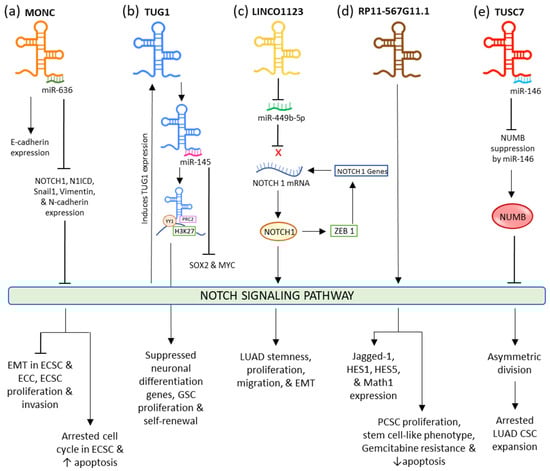 In endometrial carcinoma (EC), tumor-suppressive MONC sponges oncogenic miR-636 to negatively regulate it. The upregulation of this lncRNA restricted the expression of NOTCH1, N1ICD, Vimentin, Snail1, and N-Cadherin, while the expression of E-Cadherin was fostered. This eventually inhibited the NOTCH signaling pathway and EMT resulting in suppressed proliferation and invasion, and induced apoptosis, and aided the arrest of the cell cycle at the G0/G1 phase in endometrial cancer cells and cancer stem cells (ECCs and ECSCs) (Figure 2a) []. Increased expression of lncRNA TUG1 (Taurine Upregulated Gene 1) is seen in different types of cancers such as bladder carcinoma, stomach cancer, and bone sarcoma [,,], while its decreased expression is seen in non-small cell lung cancer (NSCLC) []. This lncRNA is credible for sustaining the stemness properties and proliferation of glioma stem cells (GSC) in glioblastoma via neutralizing miR-145 by sponging it in the cytoplasm and modulating transcription factors MYC and SOX2. In the nucleus, it forms a polycomb structure with YY1, PRC2, and H3K27, from which histone H3K27 undergoes locus-specific methylation via the activity of YY1 to limit the neuronal differentiation genes (Figure 2b). In lung adenocarcinoma (LUAD), ZEB1, an EMT transcriptional factor, activates LINC01123 and NOTCH1. LINC01123 functions by sponging miR-449b-5p and blocking its inhibitory effect on NOTCH1 mRNA; this results in the expression of NOTCH1, thus mediating the promotion of the NOTCH1-dependent NOTCH signaling pathway. This results in the lncRNA facilitating increased stemness, proliferation, migration, malignant transformation, and EMT in LUAD (Figure 2c) []. In pancreatic cancer, RP11-567G11.1 is observed to upregulate the NOTCH signaling pathway and the expression of its downstream components. This aberrant activation resulted in the progression of the cell cycle, PCSCs proliferation, tumorigenesis, and decreased apoptosis. RP11-567G11.1 also mediated the chemoresistance to antimetabolite Gemcitabine (Figure 2d) []. LncRNA TUSC-7 is responsible for inactivated NOTCH signaling in lung adenocarcinoma (LUAD) stem cells. This leads to the disruption in the symmetric division, causing the appointment of asymmetric division and ultimately arresting the CSC expansion.
