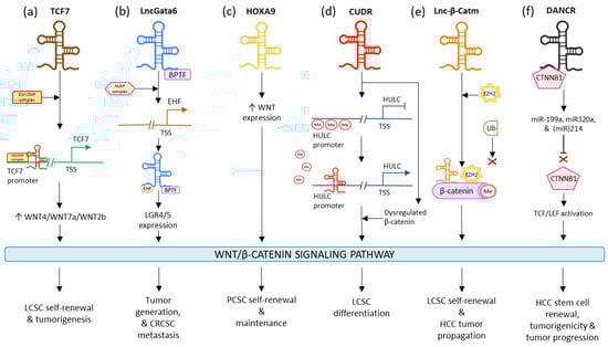 LncTCF7 appoints the SWI/SNF to the TCF7 promoter and improves its expression to surge the levels of WNT7a/WNT4/WNT2b, which activates the WNT signaling pathway. The lncTCF7-associated WNT stimulation results in the maintenance of the self-renewal and tumorigenic ability of LCSCs (Figure 3a) []. LncGata6 enhances tumor generation and metastasis in colorectal CSCs. LncGata6 associates with Bromodomain PHD Finger Transcription Factor (BPTF) and adopts the Nucleosome Remodeling Factor (NURF) complex to trigger ETS homologous factor (EHF) transcription, which makes up the lncGata6–BPTF–EHF axis to generate LGR4/5 expression and eventually activate the WNT signaling pathway (Figure 3b) []. LncRNA HOTTIP is observed to drive the stimulation of the WNT/β-Catenin signaling pathway; this induces the cell generation and chemoresistance in osteosarcoma. It is also responsible for elevating the stemness of PCSCs by regulating the WNT pathway. HOXA9 regulates the stimulation of the WNT pathway in PCSCs by promoting WNT. HOXA9 targeted stem cell transcription factors (SOX2, Nanog, OCT4, and LIN28) and markers (ALDH1, CD44, and CD133) in order to sustain PCSC properties such as inducing CSC expansion and self-renewal (Figure 3c) []. Interestingly, LncRNA CUDR stimulates lncRNA HULC by obstructing the methylation of the HULC promoter; additionally, it dysregulates β-Catenin thus promoting malignant differentiation in human-liver stem cells (Figure 3d) []. LincRNA-p21 is seen to reduce the activity of β-Catenin signaling, ultimately mediating the negative regulation of self-renewal, viability, and glycolysis of colorectal-cancer stem cells (CRCSCs) []. The levels of lncRNA H19 are observed to plummet in bladder cancer tissues. H19 is complexed with the enhancer of zeste homolog 2 (EZH2), such that this association results in the activation of WNT/β-Catenin. This activation reduces the expression of E-cad and increases tumor metastasis. Upregulated H19 is also responsible for promoting bladder-cancer cell migration []. Lnc-β-Catm catalyzes the methylation process of β-Catenin, by binding to it along with methyltransferase EZH2. This limits the ubiquitination of β-Catenin and thereby stabilizes it, which eventually drives the activation of the WNT/β-Catenin signaling pathway. This activation promotes self-renewal and maintenance of LCSCs and tumor progression of HCC (Figure 3e) []. In HCC, microRNAs miR214, miR320a, and miR-199a are seen to have a suppressive effect on CTNNB1; DANCR blocks this suppression by associating with tethering to CTNNB1. This induces the activation of TCF/LEF by β-Catenin, which guides the positive regulation of HCC stem cells’ self-renewal, tumorigenicity, and cancer progression (Figure 3f) []. In gastric cancer, HOTAIR was seen to be majorly regulated in cisplatin-resistant gastric cancer cells and tissues. It was observed that the higher expression of HOTAIR promoted gastric-cancer cell proliferation, enhanced the transition of cell cycle G1/S, as well as decreased cancer cell apoptosis by activating WNT/β-Catenin signaling. Moreover, the lncRNA was also responsible for binding and inhibiting miR-126 expression; this resulted in the promotion of VEGFA and PIK3R2 expression and activation of the PI3K/AKT/MRP1 pathway [].