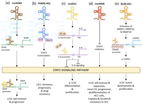 LncRNA downregulated in liver-cancer stem cell (lnc-DILC) acts as a tumor suppressor by declining the proliferation rates of CSC and differentiation of the LCSCs []. It also has an intense hindering effect on the autocrine pathway of IL-6/JAK2/STAT3 signaling []. This lncRNA lowers the expression of STAT3 as well as IL-6 and also limits the translocation of STAT3 to the nucleus. It also acts by inhibiting the NF-κB-mediated induction of IL-6. In various tumor stem cells, IL-6 is highly expressed by the NF-κB signaling pathway which is triggered by growth factors such as TNF-α and IL-1β (Figure 4c) [,]. LncRNA DILC and lncSOX4 are well known for controlling CSC properties by the STAT3 pathway in liver cancer. Lnc-DILC can also regulate the JAK2/STAT3 signaling. Overexpression of lnc-DILC lowers the elevated levels of phospho-STAT3 protein, reduces the translocation of STAT3 to the nucleus, and oppresses the transcriptional activity of STAT3-responsive segments. In CSC spheroids, the decreased regulation of lnc-DILC activates TNF-α and IL-1β-triggered IL-6 expression. Thus, this lncRNA can synchronize the crosstalk between the inflammatory signaling and the autocrine IL-6/STAT3 pathway to affect the expansion of LCSC []. On the other hand, lncSOX4 increased regulation has been associated with critical liver cancer. It is positively regulated in the CD133+ liver cancer cell population and CSC spheroids and is crucial for the self-renewing activities and tumorigenic capability of the liver CSCs. LncSOX4 crosstalks with STAT3 and inducts it to the promoter region of SOX4, stimulating the H3K4me3 and H3K27ac alterations to increase the SOX4 promoter stimulation and thus SOX4 expression. The lncSOX4/STAT3-dependent SOX4 expression is significant for sustaining liver CSC proliferation (Figure 4a) []. Upregulated FOXD2-AS1 was identified in maintaining the stemness in laryngeal squamous cell carcinoma (LSCC) and decreasing the reactions to chemotherapy drugs, while its under-regulation had opposing consequences. FOXD2-AS1 is complexed as a scaffold with STAT3 and PRMT5, stimulating the transcription STAT3, which is important for maintaining tumor stemness and enabling chemotherapeutic resistance. Thus, FOXD2-AS1 acts as an upstream activator of STAT3 and aids cancer progression (Figure 4b) []. LncARSR overexpression is seen in CD24+/CD133+ LCSCs as well as in hepatoma spheres augmented with CSC. Its upregulation causes blockage of STAT3 inhibition, thus activating the STAT3 signaling. STAT3 also plays a downstream role in regulation by lncARSR in HCC cells. LncARSR is responsible for LCSC expansion by rising the dedifferentiation of hepatoma cells and increasing the self-renewal, progression, and tumorigenesis capacity of LCSCs. It also aids drug resistance and tumor recurrence (Figure 4d) []. In early LSCC, the levels of lncRNA PTCSC3 in plasma are low. The increased expression of PTCSC3 causes repression of LSCC cell proliferation; thus, the lncRNA acts as a tumor suppressor. In UM-SCC-17A cells, PTCSC3 hindered STAT3 and HOTAIR’s expression, while STAT3 was responsible for increasing the expression of HOTAIR. Thus, it can be stipulated that the oppressive effect of PTCSC3 on tumor progression can be connected to lncRNA HOTAIR []. The downregulation of LncRNA DLX6-AS1 may cause an inhibitory effect on the methylation of the CADM1 promoter. This may lead to the inactivation of the STAT3 signaling pathway. Upregulated CADM1 results in the suppression of the stem cell characteristics of liver CSCs []. In HCC, overactivated lncRNA DLX6-AS1 confers the methylation of CADM1 promoter via activation of methyltransferases DNMTs and expression of SOX4 in LCSCs and thus upregulating the STAT3 signaling pathway. This led to decreased expressions of SOX2, OCT-4, CD13, and CD133 in LCSCs and induced tumor formation and proliferation (Figure 4e) [].