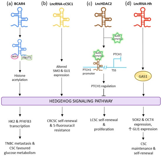Yes-associated protein 1 (YAP) is responsible for upregulating the transcription of lncRNA BCAR4, which interacts with SNIP1 and PNUTS to regulate the p300-dependent histone acetylation carried by H3K27ac of the non-canonical Hedgehog and GLI2 transcriptional cascade. This stimulates the transcription of enzymes HK2 and PFKFB3; thus, allowing BCAR4 to promote metastasis and invasion in triple-negative breast cancer as well as reprogram glucose metabolism in favor of the CSCs (Figure 5a) []. LncRNA-cCSC1 is seen to be overexpressed in colorectal cancer cells (CRC) and CRCSCs. The exhaustion of lncRNA-cCSC1 prominently hindered the self-renewal activity of the CRCSCs and decreased their chemo-drug resistance to 5-fluorouracil. Meanwhile increased expression of lncRNA-cCSC1 led to triggered self-renewal of CSCs as well as assisting in 5-fluorouracil drug resistance. Abnormal expression of this lncRNA resulted in the transfiguration of SMO and GLI family zinc finger 1 (GLI1) expression in the Hedgehog signaling pathway (Figure 5b) []. LncRNA lncHDAC2 is overexpressed in LCSCs. In the LCSC niche, it is associated with histone deacetylase-2 (HDAC2). LncHDAC2 regulated PTCH1 downregulation to stimulate Hedgehog signaling, thus increasing the self-renewal activity of LCSCs (Figure 5c) []. Overexpression of ASAP1-IT1 is seen in cholangiocarcinoma (CCA) tissues and cells. This lncRNA is responsible for activating the Hedgehog pathway via the increased regulation of SMO and GLI1, thus inducing cell proliferation, cell migration, and the progression of EMT [].