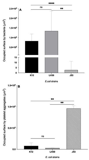 Occupied surface (µm2) by bacteria (A) and platelet aggregates (B) for each E. coli strain in platelet-bacteria mixtures. (A): Bars represent Mean with SD. Black column: occupied surface by E. coli K12 (8.23 × 102 ± 3.64 × 102). Grey column: occupied surface by E. coli LH30 (1.34 × 103 ± 1.04 × 103). Striped grey column: occupied surface by E. coli J53 (2.71 ± 8.57). (B): Bars represent Mean with SD. Black column: occupied surface by platelet aggregates in platelets-K12 mixture (795.6 ± 710.5). Grey column: occupied surface by platelet aggregates in platelets-LH30 mixture (281.2 ± 36.71). Striped grey column: occupied surface by platelet aggregates in platelets-J53 mixture (9583 ± 630.7). **,****: significant difference. ns: non-significant. Significant differences between the two groups were determined using the two-tailed, paired Student. ** p < 0.01, **** p < 0.0001.