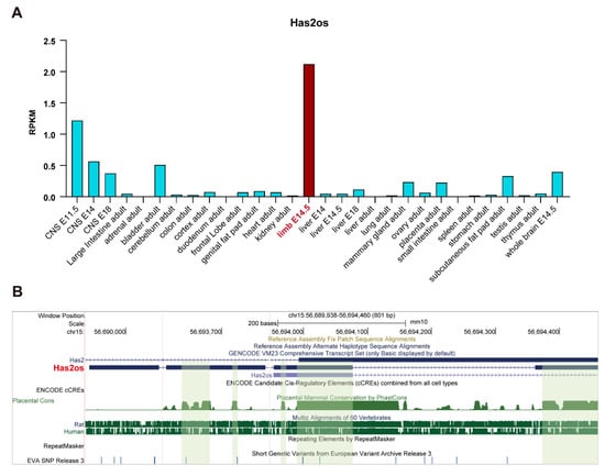 lncRNA Has2os was highly expressed in skeletal muscle. (A). lncRNA Has2os was significantly highly expressed in skeletal muscle. Vertical coordinate is RPKM (reads per kilobase of transcript per million reads mapped). Data were obtained from the NCBI database (https://www.ncbi.nlm.nih.gov, Accessed on 12 February 2022). (B). lncRNA Has2os is harbored in the Has2 gene, and conserved across multiple vertebrate species especially in human and mice. Data were obtained from UCSC genome browser (http://www.genome.ucsc.edu, Accessed on 15 October 2021).