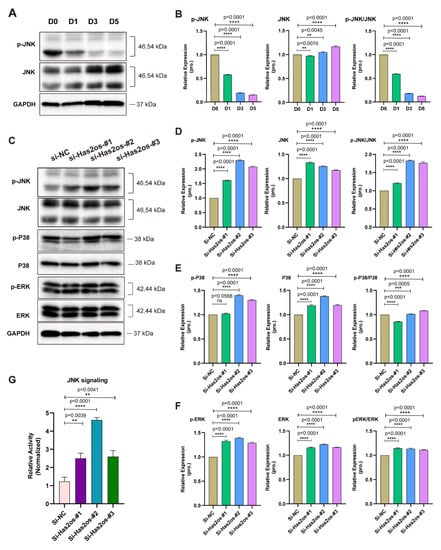 The MAPK signaling pathway is one of the important signaling systems of living organisms, and is reportedly related to cell proliferation, differentiation, and apoptosis. In our previous studies, the MAPK signaling pathway played a crucial role in the proliferation of C2C12 myoblasts. We tested the levels of phosphorylation and total JNK protein expression during C2C12 cell differentiation. As shown in Figure 4A, the levels of the p-JNK protein sharply decrease as cell differentiation progresses, while the total JNK protein increases slightly. By calculating the grayscale values of p-JNK and JNK proteins, it was found that the ratio of the two gradually decreased with differentiation (Figure 4B). To further explore whether Has2os could regulate the MAPK signaling pathway, we detected three important MAPK branching signaling pathways—JNK/MAPK, p38/MAPK, and ERK1/2/MAPK—in the Has2os-depleting and NC cells. As shown in Figure 4C, compared with si-NC cells, the protein expression levels of phosphorylated JNK (p-JNK) were all elevated in si-Has2os cells. The total JNK protein did not change, while another two MAPK branching signaling phosphorylated proteins, p-p38 and p-ERK, as well as their corresponding total proteins, were not clearly different in the si-Has2os-#1-, si-Has2os-#2-, and si-Has2os-#3-transfected cells from the si-NC cells. The relative quantitative analysis of the proteins also showed results consistent with the Western blots (Figure 4D–F). Furthermore, to verify whether Has2os could affect the JNK signaling pathway, we performed a pathway reporter assay. Interestingly, compared with the negative group (si-NC), knocked down Has2os by all the three siRNAs (si-Has2os-#1, si-Has2os-#2, si-Has2os-#3) significantly increased the activity of JNK signaling (Figure 4G), suggesting that Has2os may regulate the differentiation of C2C12 cells by inhibiting JNK signaling activity.