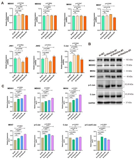 Then, we tested the mRNA levels of the signaling molecules upstream of the JNK/MAPK signaling pathway and found that the mRNA levels of MEKK1, MEKK2, MKK4, and MKK7 did not change after si-Has2os. At the same time, there was no significant change in the mRNA expression levels of JNK1 and JNK2. However, the mRNA of the signaling molecule C-Jun downstream of the JNK/MAPK signaling pathway was significantly elevated (Figure 5A). At the same time, the protein levels of MEKK1, MEKK2, MKK4, MKK7, p-C-Jun, and C-Jun after si-Has2os were determined by Western blot, and the protein levels of MEKK1, MEKK2, MKK4, MKK7, and p-C-Jun were significantly upregulated (p < 0.0001, Figure 5B). Quantitative analysis of protein conduction also showed a significant increase in protein levels in MEKK1, MEKK2, MKK4, and MKK7 (p < 0.0001, Figure 5C). Using the measured protein gray value, the ratio of p-C-Jun to C-Jun was obtained, and it was found that the ratio after si-Has2os was higher than that of the si-NC group (p < 0.0001, Figure 5C). The above results validated that Has2os negatively regulates the JNK/MAPK signaling pathway.