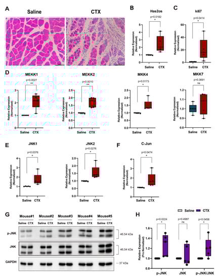 Furthermore, we contemplated whether Has2os was involved in skeletal muscle regeneration. Firstly, we constructed a mice muscle regeneration model by CTX (Cardiotoxin), separately injecting five mice. The immunohistochemistry results, as shown in Figure 6A, demonstrate that muscle tissue injected CTX with large numbers of accumulating inflammatory cells, and tissue cells were in the early stage of repair. The RNA expression levels of Has2os and ki67 after muscle injury were then measured by qRT-PCR. As shown in Figure 6B,C, the results demonstrate that the RNA expression levels of Has2os and ki67 are higher than those of the control group, which not only proves that muscle satellite cells are activated and proliferated in the early muscle tissue of muscle injury repair, but also that Has2os is involved in early repair after muscle injury. To explore the changes in the JNK/MAPK signaling pathway during impaired muscle regeneration, we first examined the mRNA levels of the upstream signaling molecules of the JNK/MAPK signaling pathway and found that the mRNA levels of MEKK1, MEKK2, MKK4, and MKK7 were significantly upregulated (Figure 6D). In addition, the results show that the mRNA levels of JNK1, JNK2, and its downstream factor C-Jun were significantly increased (Figure 6E,F). Then, we used Western blot to analyze the p-JNK and JNK proteins expression in these mouse tissue and found that the p-JNK protein levels were significantly upregulated, whereas JNK protein levels only changed slightly (Figure 6G). The protein gray calculated value also showed that the ratios of p-JNK to JNK were greater than those of the control saline group (Figure 6H). The above results suggest that both Has2os and the JNK/MAPK kinases cascade are involved in the early repair of muscle damage.
