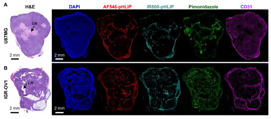 The ITDs of AF546-pHLIP, IR800-pHLIP, hypoxia (pimonidazole staining), microvessels (CD31 staining), and nuclear DAPI staining were examined at 4 h post-injection of the cocktail of AF546-pHLIP and IR800-pHLIP. Figure 2 shows the results obtained from the same whole sections of a representative U87MG or IGR-OV1 tumor. Corresponding H&E staining of adjacent slides displayed multiple areas of necrosis of U87MG (Figure 2A; coagulative necrosis) and IGR-OV1 tumors (Figure 2B; cavity-like liquefactive necrosis). In both tumor models, the ITD of pHLIP labeled with two different dyes appeared identical and heterogeneous throughout the section. Multiple comparisons of whole-section images indicated a close spatial relationship of pHLIP distribution with both hypoxia and necrosis (especially at the periphery of massive necrosis shown in Figure 2A). Similar results were shown in additional whole-section images of the other three U87MG (Supplementary Figure S2) or IGR-OV1 (Supplementary Figure S3) tumors. In addition, either AF546-pHLIP or IR800-pHLIP accumulation was also observed at the periphery of whole-tumor sections of both tumor models (Figure 2, Supplementary Figures S2–S8). This is a phenomenon also exhibited by other pHLIPs [23,29,31,32,45]. Enlarged views (Supplementary Figures S4–S8) indicate that such accumulation was attributed to the background levels of the probes in the tumor capsule and/or in mouse skin (if contained in the tumor sample). Both are probably inherently acidic tissues.