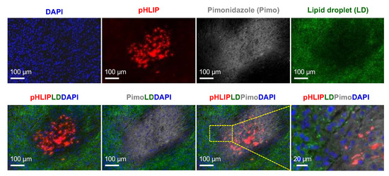 Spatial relationships among the intratumoral distribution (ITD) of pHLIP, hypoxia, and lipid droplets. pHLIP distribution (AF546-pHLIP, red), pimonidazole-stained hypoxia (gray), and lipid droplet staining (green) were examined at the same sites of the same tumor sections. Shown here are images acquired from a representative high pHLIP-accumulated region in a U87MG tumor section. The lipid droplet-specific fluorescent probe Lipi-Green was used for staining the lipid droplets. Blue indicates nuclei stained with DAPI. An enlarged view of the dotted rectangle clearly shows the cellular localization of the lipid droplets.