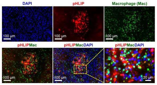 To investigate the possibility of the ITD of pHLIP being attributed to the targeting of tumor-associated macrophages (important components of the tumor microenvironment [42,43]), representative regional sites of pHLIP distribution were imaged as described in Section 2.5.2. The acetone-fixed sections were then subjected to staining of CD11b (a marker of tissue macrophages) using purified rat anti-mouse CD11b monoclonal antibody (Clone M1/70.15; 1:100 dilution; Bio-Rad Laboratories Inc., Hercules, CA, USA) [43,44], followed by Alexa Fluor 594–conjugated goat anti-rat IgG as mentioned above. Corresponding images were taken as described above.
