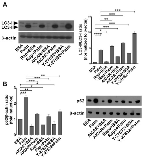 Palmitate exposure induces autophagy but inhibits the fusion of autophagosomes and lysosomes in BMDMs. Administration of AICAR, rapamycin, or Y-27632 interferes with this inhibition. (A) Expression of LC3I and LC3II in BMDMs exposed to palmitate for 24 h alone or together with rapamycin (100 nM), AICAR (0.5 mM), or Y-27632 (30 μM) determined by Western blot analysis. β-actin was used as a loading control. One representative gel of three is shown. (B) Expression of p62 in BMDMs exposed to palmitate alone or together with rapamycin (100 nM), AICAR (0.5 mM), or Y-27632 (30 μM) determined by Western blot analysis. β-actin was used as a loading control. One representative gel of three is shown. All data are expressed as mean ± SD (n = 3). Asterisks indicate statistically significant difference (* p < 0.05, ** p < 0.01, *** p < 0.001, **** p < 0.0001).
