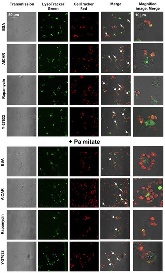 Delayed appearance of apoptotic cells in the phagolysosomes of BMDMs triggered by 24-h palmitate exposure is reverted by administration of AICAR, rapamycin, or Y-27632. Appearance of Deep Red Dye-stained red apoptotic thymocytes in the LysoTrackerTM Green-stained green phagolysosomes of BMDMs exposed to palmitate (0.4 mM) for 24 h alone or together with rapamycin (100 nM), AICAR (0.5 mM), or Y-27632 (30 μM) detected with confocal microscopy. Yellow/orange colors (arrows) indicate apoptotic cells appearing in the phagolysosomes following fusion of phagosomes with lysosomes.
