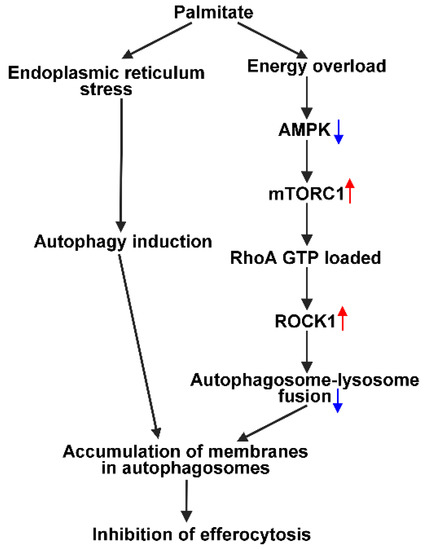 The data presented indicate that palmitate induces a defective autophagic flux in BMDMs in which increased production of autophagosomes is not coupled to an enhanced lysosomal degradation. The amount of LC3-II was reported to reflect the number of autophagosomes within the cells [49]; consequently, accumulation of LC3-II in palmitate-exposed BMDMs reflects a large amount of membranes accumulating in the autophagosomes. Phagocytosis, however, must be accompanied by fusion of vesicles at the plasma membrane site of apoptotic cell uptake, which allows growing of the nascent phagosome and serves to compensate for the loss of plasma membrane surface area [72], and the vesicle sources are the endosomes and lysosomes [15,16]. Thus, we propose that inhibition of efferocytosis by palmitate might be the result of an inadequate supply of membranes for the phagocytosis due to the initiation of the defective autophagy (Figure 7). Further studies are required to determine whether ROCK activation also interferes with the phagosome–lysosome fusion process.