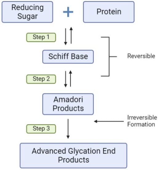Another major environmental factor which may influence the risk for T1D is increased consumption of highly processed foods. Food processing imparts commercially desirable properties such as increased shelf-life, flavor and digestibility, using methods such as dry heat baking [81]. This, in combination with the higher sugar, fat, refined carbohydrate and lower wholegrain content of highly processed foods, amplifies the production of chemical compounds known as advanced glycation end products (AGEs). The most common and well-studied AGE ligands in vivo are carboxymethyl lysine (CML) and methyl-glyoxal derived hydroimidazolones (MG-H1), which are both known to bind to AGE receptors such as RAGE [82]. Scheijen et al. (2016) found that food items with short heating times that are low in protein and carbohydrates and high in water, such as fruits and vegetables, have the lowest AGE content [83]. AGEs are formed via non-enzymatic reactions, where reducing sugars such as glucose react with amine residues on proteins [84] (reviewed in detail here, [85]). This process involves the Maillard reaction which can be subdivided into three steps (Figure 3), with the first step producing Schiff bases before rearranging into more stable Amadori products which are reversible, followed by the formation of AGEs which are irreversible [86]. Exogenous AGEs in foods can be absorbed across the gastrointestinal tract, contributing to the body’s AGE pool [87]. Based on human and animal studies, approximately 10% of total AGEs eaten are thought to be absorbed into the blood, with two-thirds remaining in the body for more than three days [88]. Studies in mice have confirmed that consumption of dietary AGEs can elevate serum and tissue AGE levels [81].