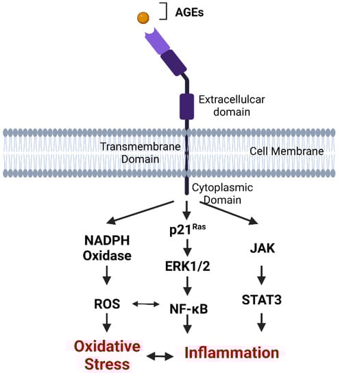 Despite AGE and RAGE interactions being studied for more than 20 years, most studies have focused on the influence of AGE-RAGE binding on pathological conditions. However, AGEs are produced under physiological conditions where their role is poorly understood and it is not clear whether varying AGE modifications can elicit different physiological responses via receptor signaling, such as via RAGE. Certainly, binding of AGEs to RAGE initiates intracellular signaling pathways leading to inflammation and oxidative stress which are important part of host–pathogen defense, but can also result in β-cell injury [101,106,108]. However, AGE ligation resulting in RAGE signaling is also implicated in many other inflammatory conditions including neurodegenerative conditions, rheumatoid arthritis, and inflammatory bowel disease [82,98,134,135]. The binding of AGEs to RAGE commonly activates the nuclear factor kappa B (NF-κB) inflammatory pathway and other transcription factors such as mitogen activated protein kinase (MAPK), and Janus kinase (JAK-STAT), increasing the production of proinflammatory cytokines (Figure 4) [136].