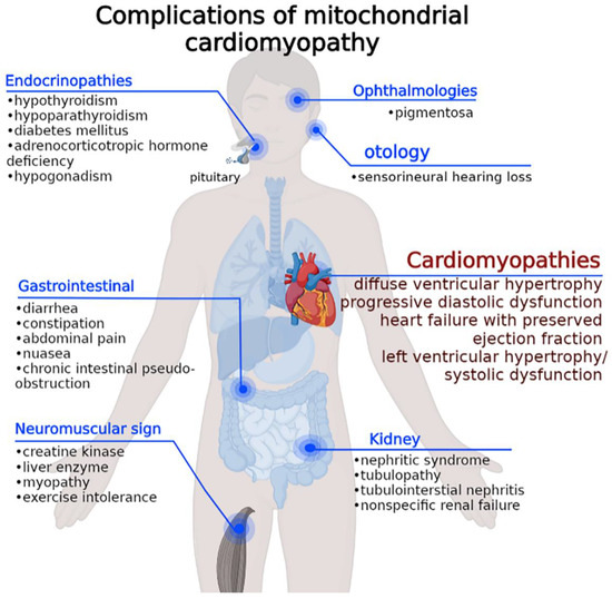 Over the last quarter-century, there has been tremendous progress in the genetics research that has defined molecular causes for MCM [4]. More than one thousand mutations have been identified, in various genes with varying ontologies. Genetic variants associated with mitochondrial dysfunction including mtDNA deletion, and nuclear and mtDNA variation, result in damage to the assembly of the MRC complexes, the maintenance of tRNAs, rRNAs, and mtDNA, and the synthesis of coenzyme Q10 (CoQ10), indicating the diverse molecules and pathways that cause hypertrophic, dilated, restrictive, and arrhythmogenic cardiomyopathies (Table 1). Whabi et al. [5] showed that the myocardial involvement in mtDNA diseases is progressive and, in association with other cardiovascular manifestations and risk factors (i.e., intraventricular conduction blocking, diabetes, premature ventricular contractions, and left ventricular hypertrophy (LVH)), an independent predictor of morbidity and early mortality.