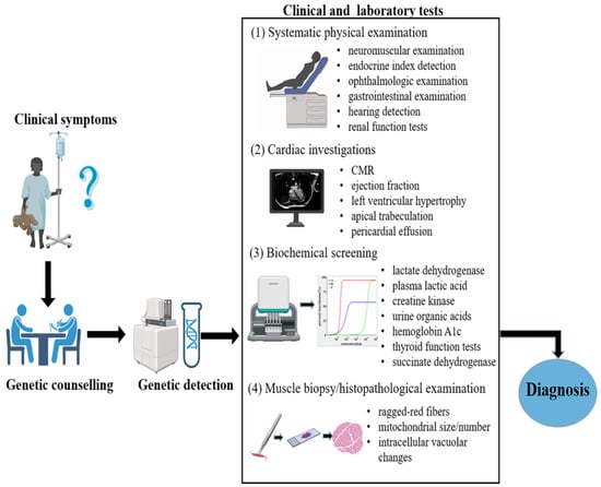 Early diagnosis of MCM is thought to be intricate and challenging because of its broad clinical and genetic heterogeneity. Although relevant diagnostic schemes have been proposed to improve detection, there remains no definitive diagnostic standard. Physicians need to maintain a high level of suspicion of MCM in patients with features and symptoms that could lead to a diagnosis of mitochondrial disorder or multisystem involvement and without a clear cause. An integrated diagnosis of MCM requires detailed genetic counselling and detection, histopathological studies, biochemical screening, cardiac investigations, including cardiac magnetic resonance (CMR), and functional assays. A flow chart for diagnosis of mitochondrial disease is shown in Figure 2.