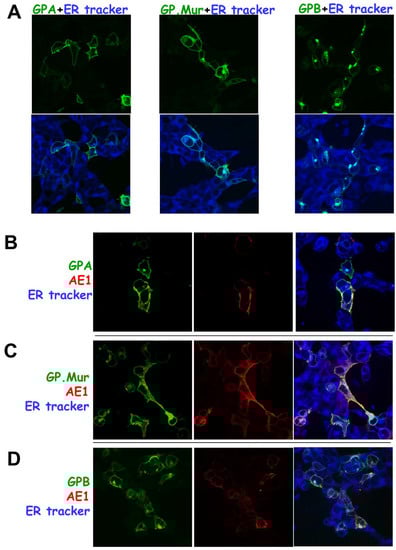 To verify the sites where GPB aggregated (Figure 3), we labeled the transfected cells with a fluorescent ER tracker. Figure 4A showed the single expression of each glycophorin fusion protein—GPAyfp, GPMURgfp, and GPBgfp, respectively. While GPAyfp and GPMURgfp were expressed on the plasma membrane, GPBgfp showed little surface expression but substantial aggregation in the ER. The degree of GPMURgfp localization to the ER was between that of GPBgfp and GPAyfp. AE1 coexpression did not affect much of the subcellular localization of GPAyfp and GPMURgfp (Figure 4B,C); on the other hand, AE1 coexpression with GPBgfp dissipated some intracellular aggregates of GPBgfp (Figure 4D).