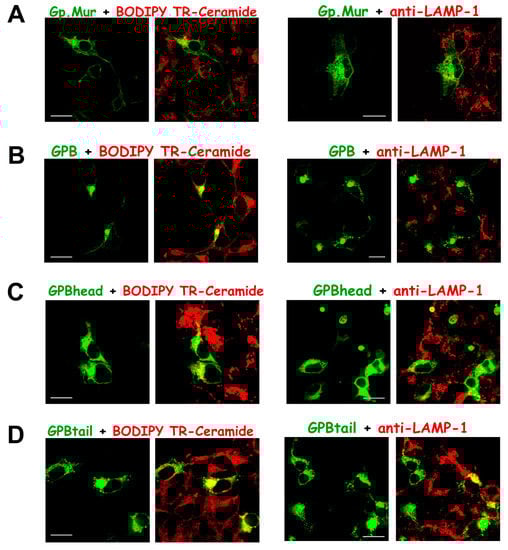 GPB and GPBtail, but not GP.Mur or GPBhead, expressed predominantly in the Golgi apparatus, suggesting a Golgi retention signal embedded in the glycophorin TM domain. HEK-293 cells were transfected with only (A) GPMURgfp, (B) GPBgfp, (C) GPBhead-GFP, or (D) GPBtail-GFP. On the second day post-transfection, the cells were labeled with a lipid marker for the Golgi apparatus—BODIPY TR-ceramide (left panel), or with mouse anti-LAMP-1 (a protein marker for lysosomes) following AF568 conjugated anti-mouse antibody (right panel). Scale bar = 25 μm.