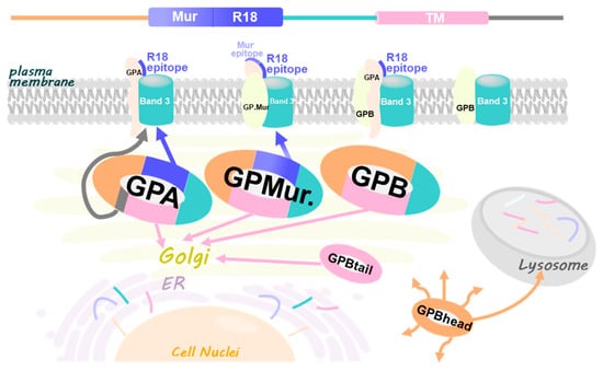 A working model illustrates different trafficking signals encoded in the glycophorin sequence and manifested in glycophorin-AE1 interaction. (TOP) The common sequence of GPA/GPB/GP.Mur and variants are divided in color-coded segments (from left to right, or the N- to the C-terminus): the N-terminal sequence (orange), the Mur epitope (light purple), the R18 epitope (purple); the pre-TMD region that interacts with band 3 and facilitates band 3-mediated anion transport (green); the TMD (pink), and the long C-terminal sequence only in GPA (dark gray). The 5 glycophorin variants studied are each presented in a hoop ring with color segments corresponding to the sequence segments described above. GPA contains all the sequence segments but the Mur epitope. GPB lacks the Mur and the R18 epitopes, as well as the long C-terminus unique to GPA. GP.Mur, evolved from GPB, contains the Mur and the R18 antigens, and also lacks the long C-terminus. GPBtail mainly expresses the TMD. GPBhead mainly expresses the N-terminal glycophorin sequence. The lack of the TMD in GPBhead makes it a diffusive, cytosolic protein destined for the lysosomes. Glycophorin transmembrane is essential for protein retention in the ER and the Golgi apparatus. The glycophorin-R18 epitope (purple) is adjacent to the pre-transmembrane region (green) that includes the Wrb motif (arisen from the AE1-GPA/GP.Mur interaction interface) and functions to assist band 3-mediated anion transport [12,24,26,33,40]. Thus, R18-mediated forward trafficking in GPA and GP.Mur may involve protein–protein interaction with band 3 and co-migration to the cell surface. The long C-terminal sequence of GPA also encodes a forward trafficking signal [33].