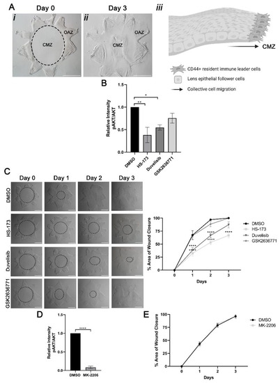 Wound healing in response to cataract surgery injury occurs in a PI3K isoform-specific manner. (A) Depiction of ex vivo post-cataract surgery culture to study mechanisms of wound repair across the cell-denuded endogenous basement membrane in the center of the lens capsule. Ex vivo post-cataract surgery explant on day 0 depicts the wounded lens epithelial cells within the original attachment zone (OAZ) and the cell-denuded central migration zone (CMZ) (i). In response to injury, collective migration across the endogenous basement membrane in the CMZ is driven by leader cells that direct the migration of the wounded epithelial follower cells (ii), arrow depicts the direction of wound healing. Collective migration across the CMZ for wound repair is completed by day 3 post-injury (iii). (B,C) Ex vivo post-cataract surgery explants were treated from Time 0 through Day 3 with individual PI3K isoform inhibitors, HS-173 for p110α; GSK2636771 for p110β; or Duvelisib for p110δ/γ. (B) Graph from Wes analysis depicts the efficacy of individual PI3K isoform inhibitors compared to vehicle control by examining the relative intensity of the PI3K effector, phosphorylated-AKT (pAKT) relative to total AKT expression compared to GAPDH (loading control). (C) Phase microscopy shows open wound area (dotted black circle) for vehicle vs. PI3K inhibitor treatment from Day 0 through Day 3. Graph depicts % area of wound closure. Results show that blocking p110α with HS-173 had the largest impact on inhibiting wound closure. (D,E) Ex vivo post-cataract surgery explants were treated with vehicle (DMSO) or the AKT specific inhibitor, MK-2206 from Time 0 through Day 3. (D) MK-2206 suppressed pAKT relative to total AKT expression and GAPDH (loading control). (E) Graph of % wound closure shows that treatment with MK-2206 had no effect on wound closure. p-values were determined from one-way ANOVA (B), two-way ANOVA with multiple comparisons (B,C) or unpaired t-test (D,E). (B, * p < 0.05, ** p < 0.01; C, **** p < 0.0001 and D **** p < 0.0001). Data is expressed as ± SEM from 2 (D,E) or 3 (B,C) independent experiments. Magnification bars = 1000 μm (A,C).